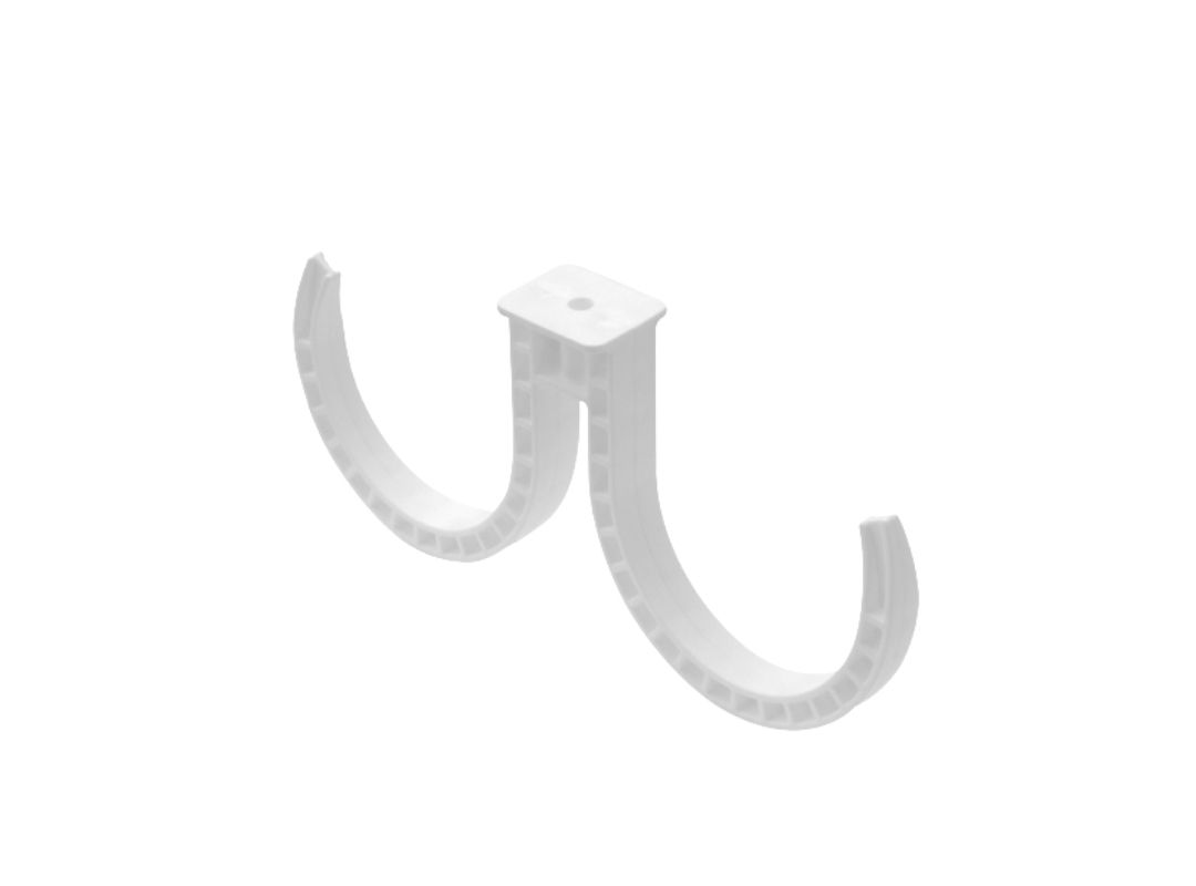 Abrazadera doble blanca para fijar tubos de ventilación con diámetro de 75 mm.